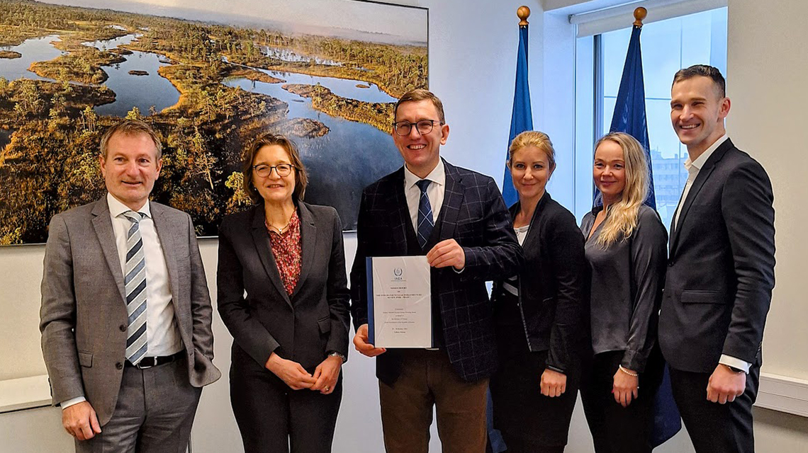 Aline des Cloizeaux (second from left), Director of the IAEA's Division of Nuclear Power, delivered the INIR report to Estonian Climate Minister Kristen Michal (centre). (Photo: IAEA)