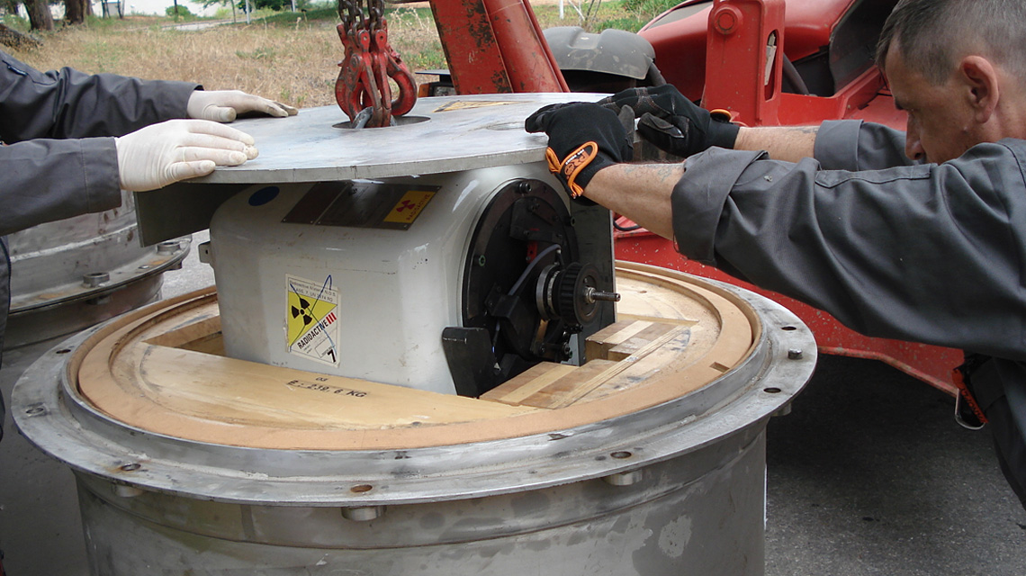 Workers placing radioactive sources into a transport container ahead of shipment to France. (Photo: C. Roughan/IAEA)