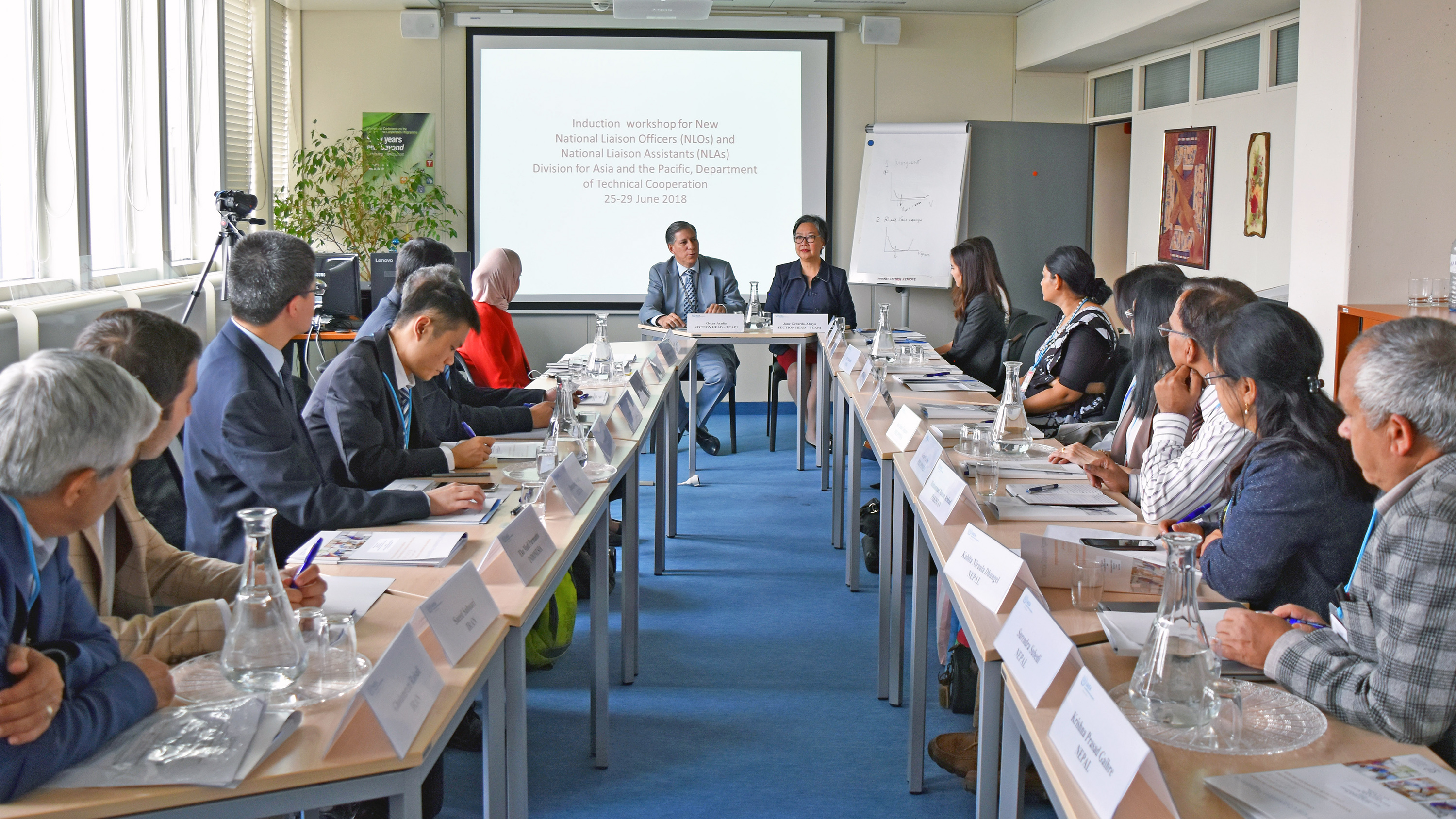 Mr Oscar Acuna and Ms Jane Gerardo-Abaya, Section Heads, Division for Asia and the Pacific, welcome the new National Liaison Officers. (Photo: H.Pattison/IAEA)