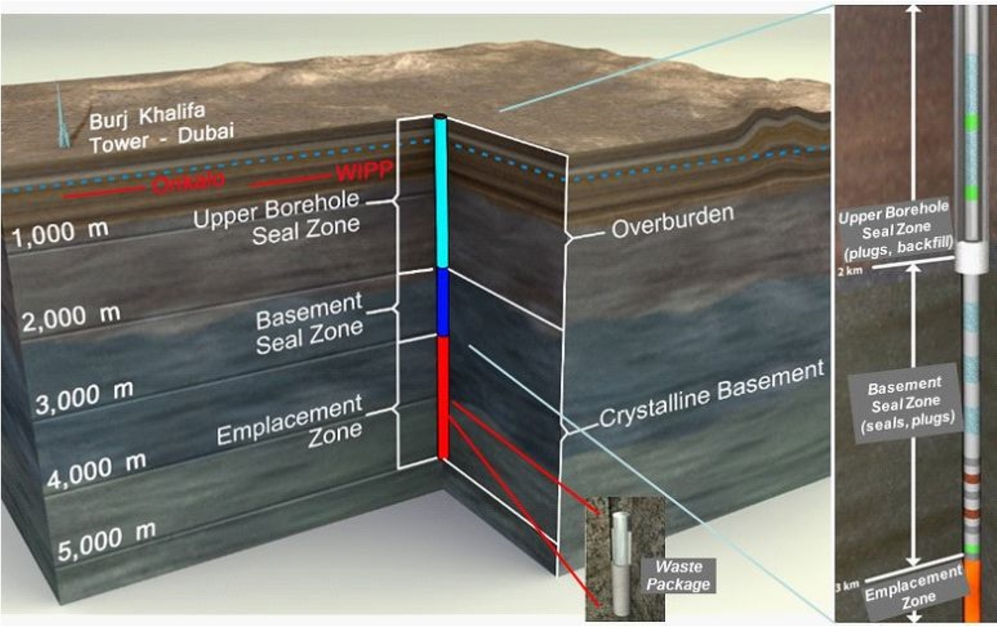 The DBD concept considers disposal in a stable geologic formation at depths of several kilometres into the base rock, although recent scoping studies have also considered depths of several hundred metres – comparable to those of a mined DGR. Figure 1 illustrates vertical emplacement and stacking of waste disposal containers over the height of a disposal zone, assumed to be located deep within the bedrock. The borehole above the disposal zone would be plugged and sealed over a height of several kilometres. Alternative depths and heights of the disposal zone are also being considered, and the specific design depends on the volume and specific properties of radioactive waste, as well as on the specific properties of the site selected for borehole disposal.