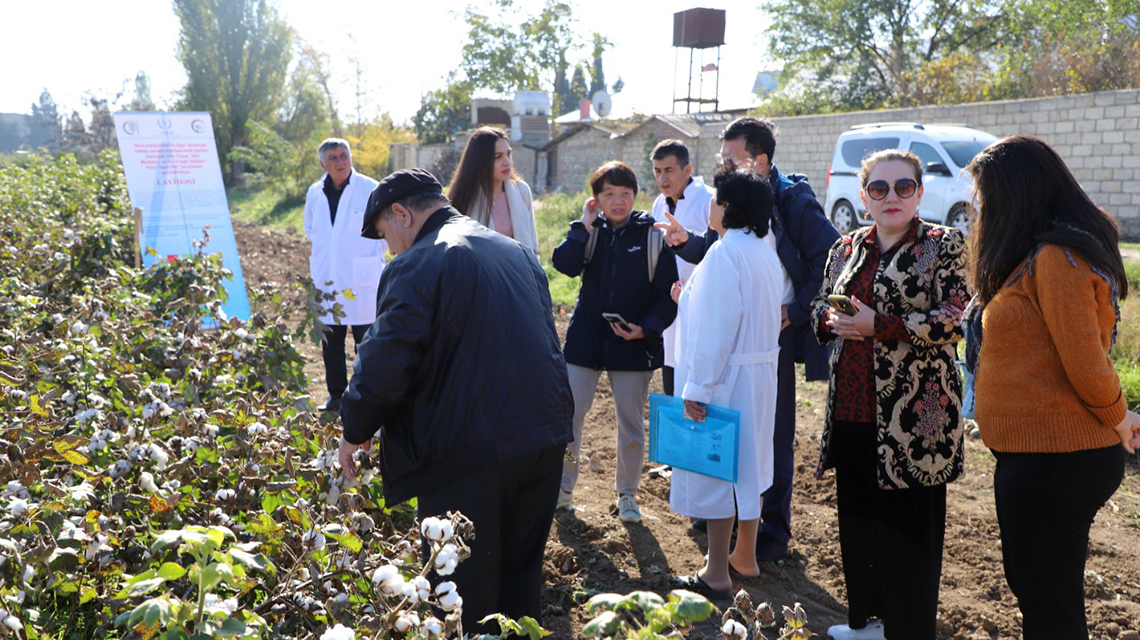 Soil scientist Lee Kheng Heng (centre) discussing climate-smart agriculture methods with Azerbaijani experts at their cotton field work outside Baku, October 2021. (Photo: Ministry of Agriculture, Azerbaijan)