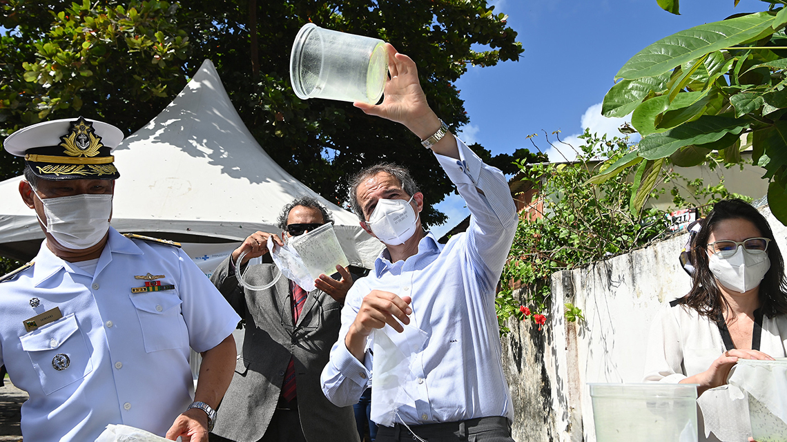 The week-long visit, Mr Grossi’s first to Latin America since he took office in 2019, kicked off in the city of Recife, where he participated in insect releases as part of an IAEA-supported programme to use the Sterile Insect Technique (SIT) to control mosquitoes in the neighbourhood of Brasilia Teimosa. The SIT is a type of birth control for insects, where male insects are mass reared and rendered unable to reproduce using radiation. They are then released in large numbers to mate with wild females, resulting in no offspring and therefore contributing to a decline in the mosquito population over time. The method has been used for decades to control agricultural pests such as the Mediterranean- and Screwworm flies and has recently been developed against mosquitoes.