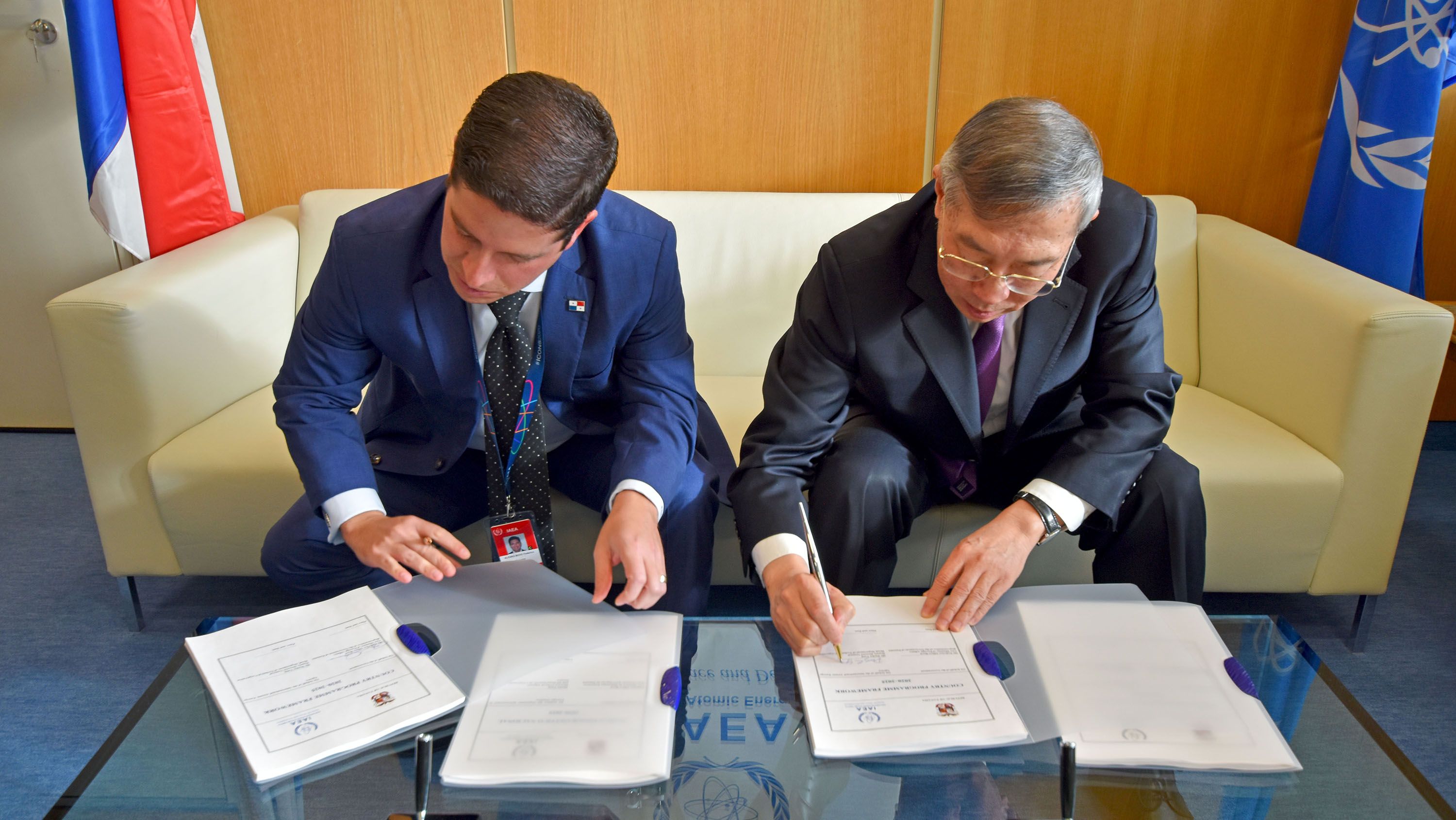 Federico Alfaro Boyd, Vice-Minister of the Ministry of Foreign Affairs, and Dazhu Yang, IAEA Deputy Director General and Head of the Department of Technical Cooperation, signing&nbsp;Panama’s Country Programme Framework (CPF) for the period of 2020–2025 on 11 February 2020. (Photo: O. Yusuf/IAEA)