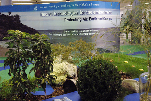 Prince Albert II of Monaco pauses to make a point as he visits the exhibit entitled "Nuclear Technologies for the Environment, Protecting Air, Earth and the Oceans". To his right: Dr. Werner Burkart, Deputy General Director for Nuclear Sciences and Applications and Dr. Ana María Cetto, Deputy General Director for Technical Cooperation.