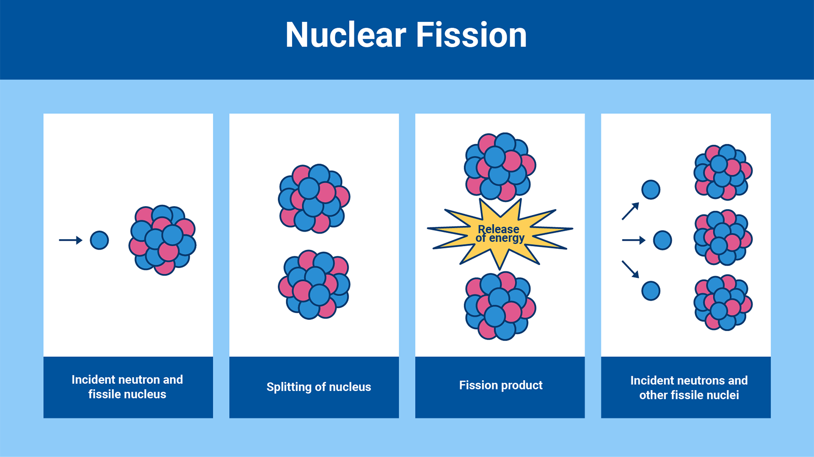 In the 1930s, scientists found out that if a neutron is fired into certain uranium atoms, they could split into two and emit a certain number of neutrons, releasing a huge amount of energy along the way. This is called fission, from the Latin word for ’split’.