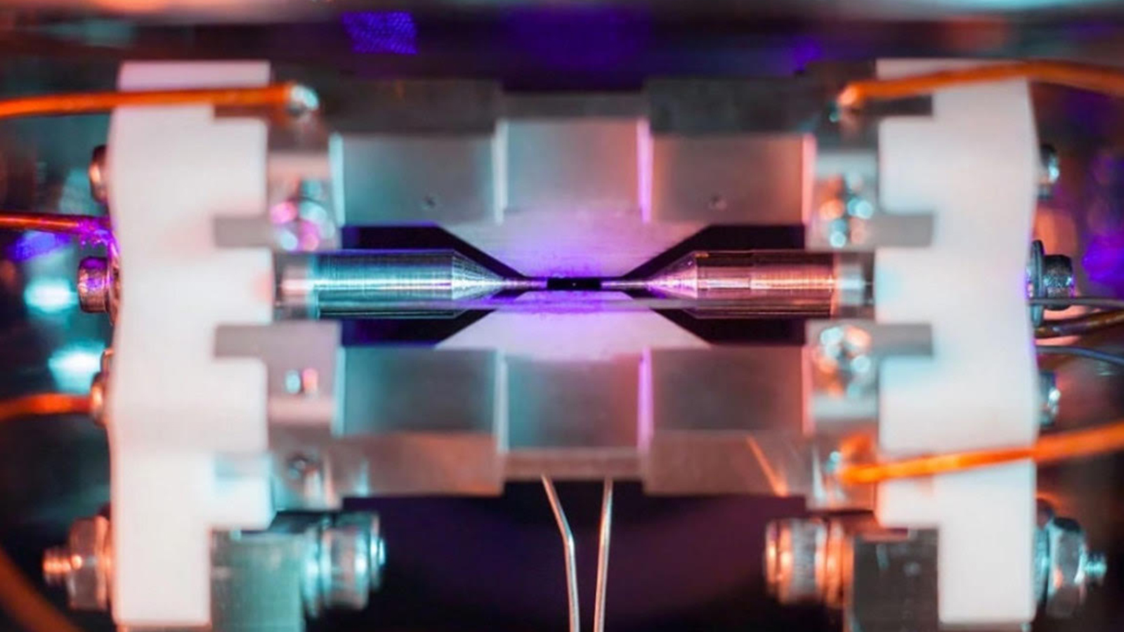 This single atom of the metal strontium is visible in this photograph because it has absorbed and re-emitted the light of a laser. The electrodes in the picture are two millimetres apart. (Photo: David Nadlinger/Oxford University)