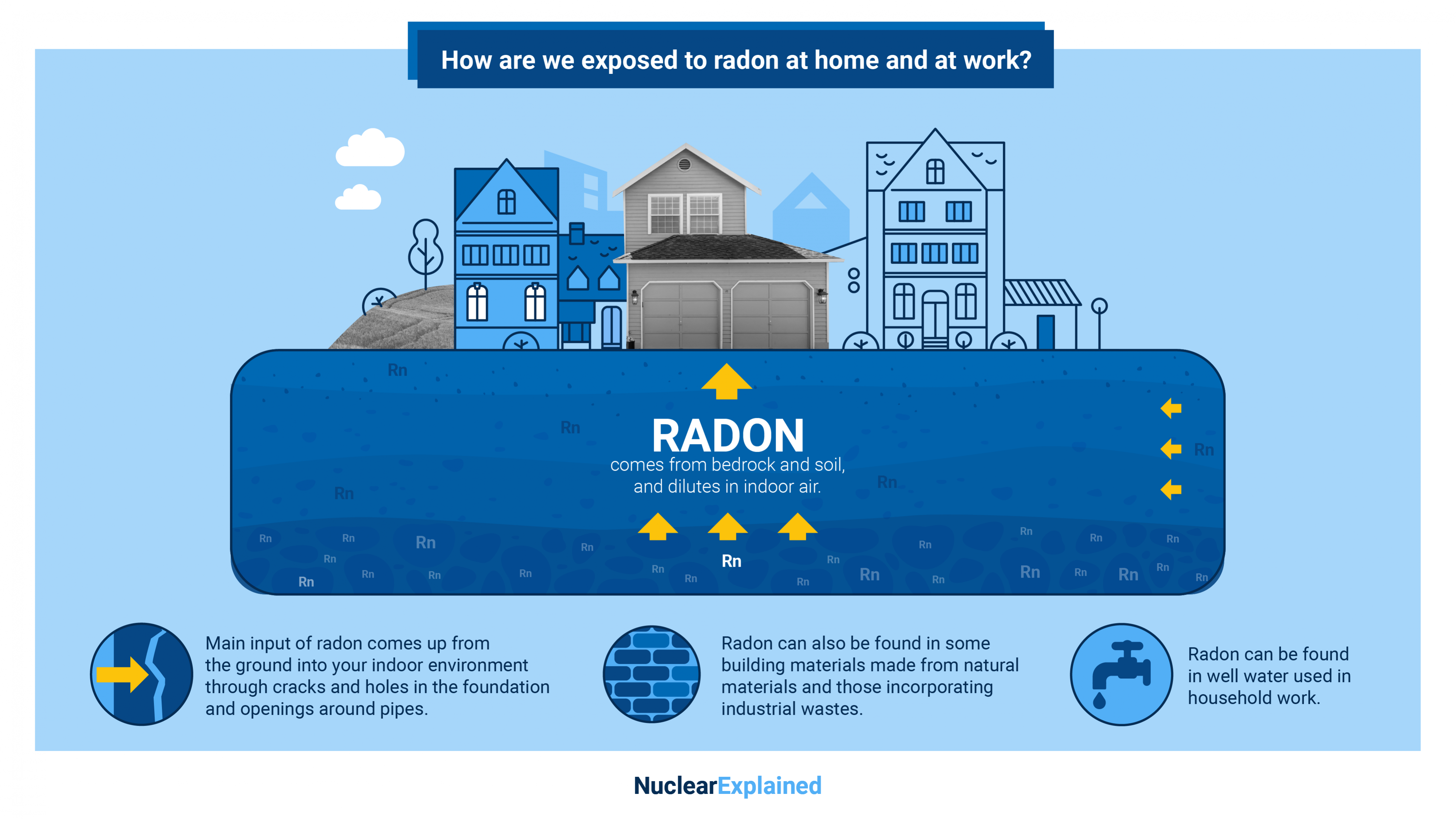Chemical elements which decay into radon, such as uranium, thorium and radium can be present in soil, water and construction materials. IAEA safety standards establish concentrations of radon in homes and at workplaces to protect the people’s health.