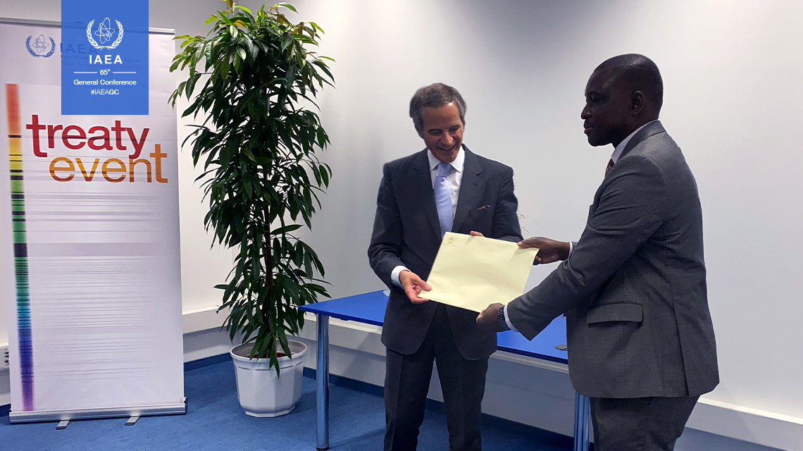 The Republic of Zimbabwe pledged its commitment to nuclear safety and security by depositing legal instruments and therefore becoming a party to various international treaties under the auspices of the IAEA. Soda Zhemu, Minister of Energy and Power Development, handed over the instruments to IAEA Director General Rafael Mariano Grossi at a short ceremony held as part of the annual Treaty Event alongside the 65th Regular Session of the General Conference today.