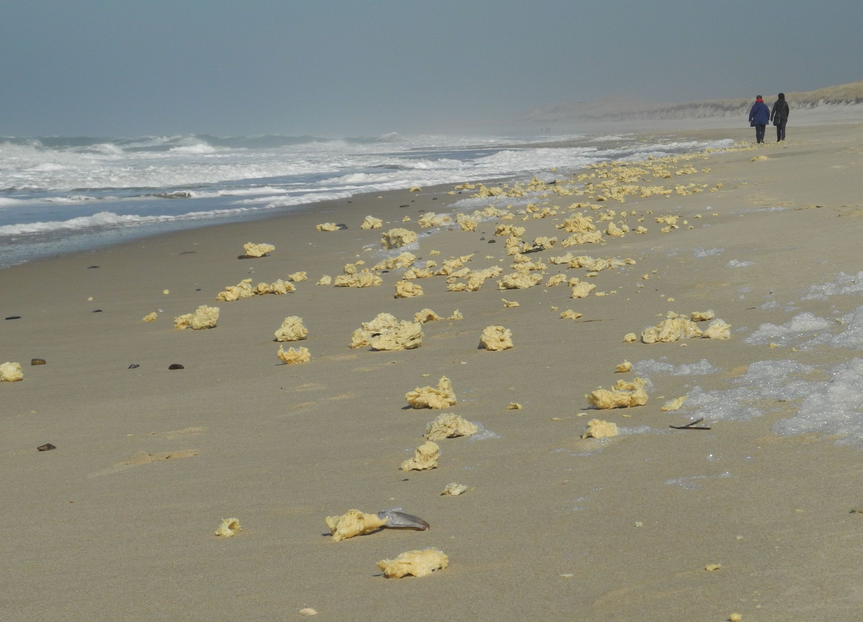 In contact with cool waters, paraffin solidifies and can accumulate along beaches for several kilometres. In 2014 more than 50 tons washed ashore on the German island of Sylt in the North Sea. Varying in size from several millimetres to more than 25 centimetres in diameter, large paraffin deposits can pose a serious threat to wildlife.