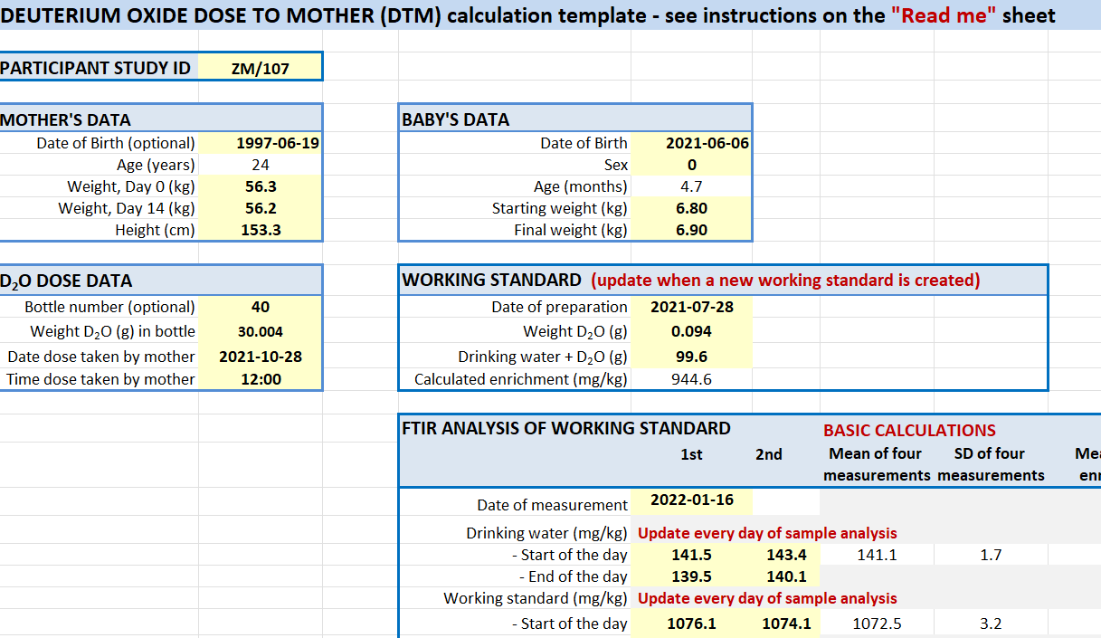 This Excel spreadsheet can be used to calculate breast milk intake in kg/day from deuterium oxide dose-to-mother data. The spreadsheet is tailored to measurement of deuterium abundance in saliva using FTIR TumbIIR instrumentation.
