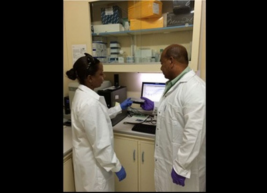 <p>Project staff working with IAEA provided PCR equipment in the Animal Health Molecular Diagnostic Laboratory in Belize City</p>