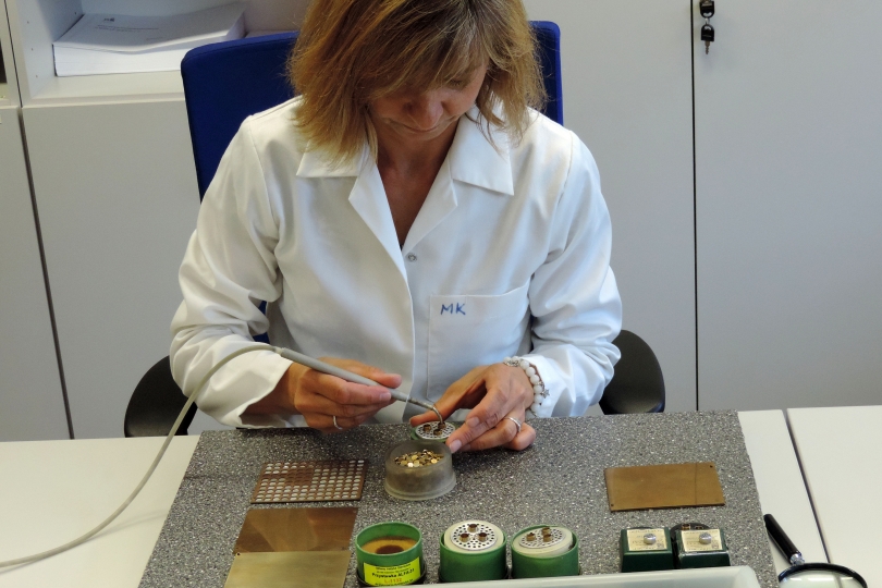После подготовки эти дозиметры отправляют на место мониторинга. Некоторые дозиметры, как, например, изображенный на этой фотографии, измеряют уровни альфа-излучения.