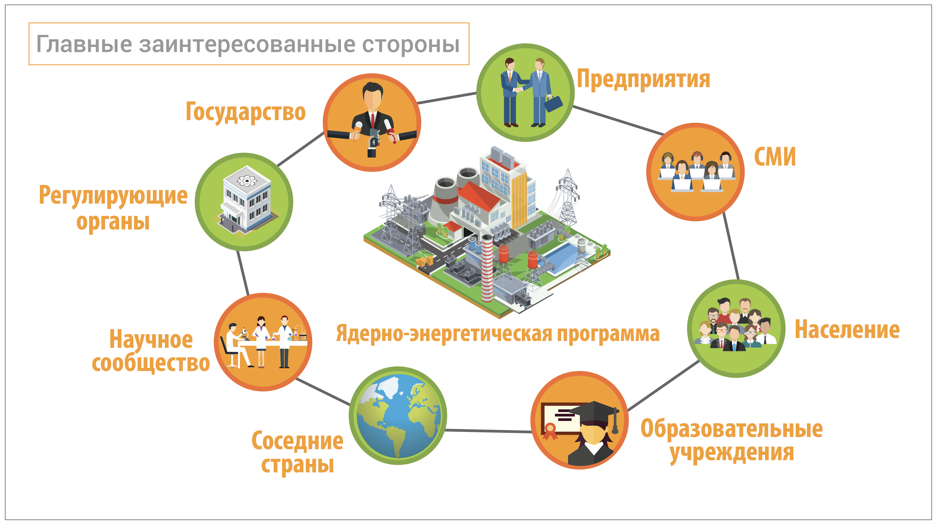 Вопрос участия заинтересованных сторон — один из 19 связанных с инфраструктурой вопросов, охватываемых этапным подходом МАГАТЭ, который изложен в документе ?Milestones? (?Основные этапы?), представляющем собой структурированный руководящий документ, которым пользуются государства-члены при создании инфраструктуры для ядерно-энергетической программы. Для содействия обмену знаниями, опытом и передовой практикой для налаживания связей со всеми заинтересованными сторонами МАГАТЭ публикует руководящие документы и проводит обсуждение общих задач и примеров надлежащей практики.