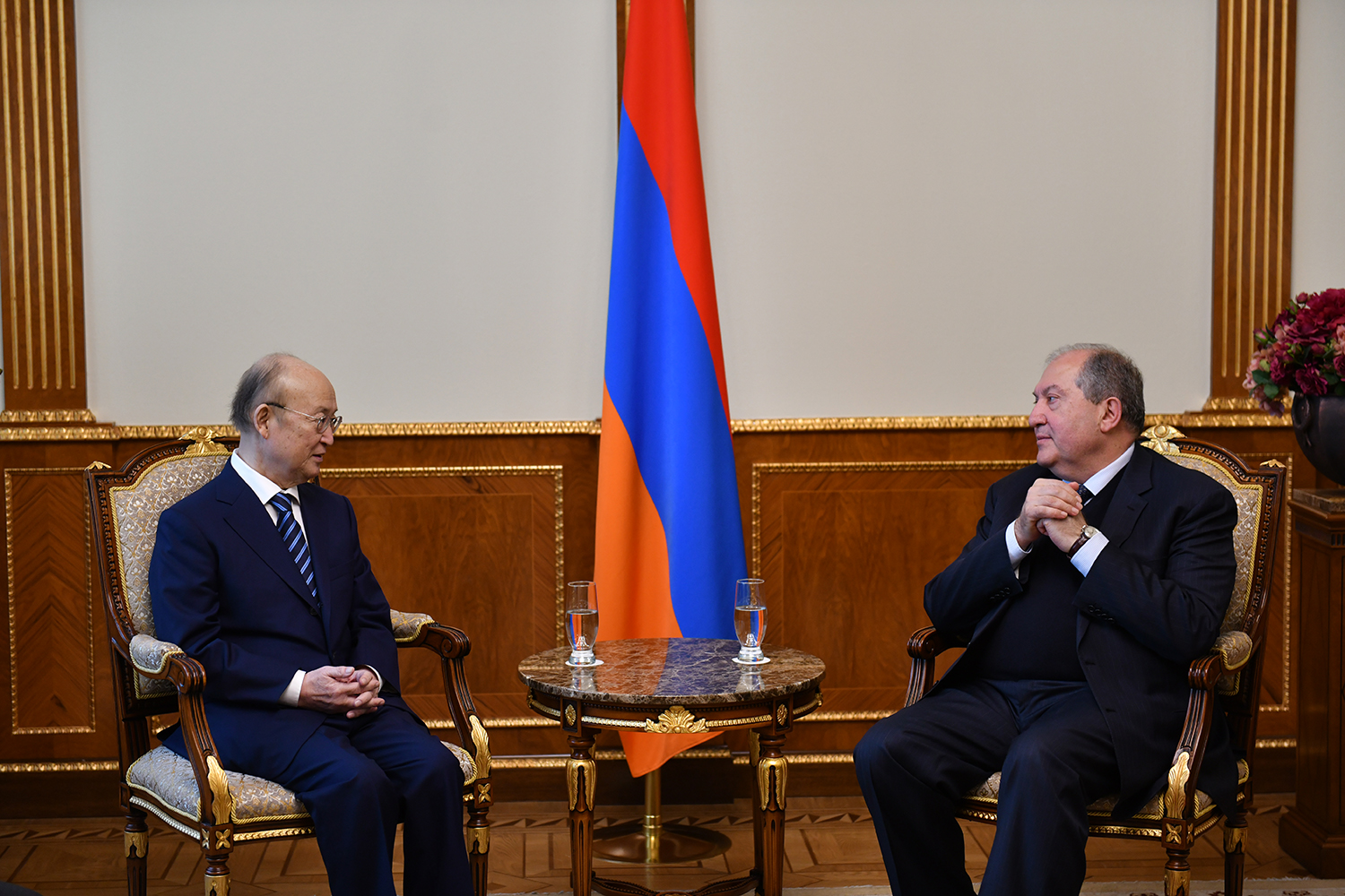 В ходе разговора с президентом Саркисяном г-н Амано остановился на участии Армении в деятельности МАГАТЭ, в том числе на тесном сотрудничестве по проектам, призванным удовлетворить энергетические потребности страны, и помощи, направленной на расширение возможностей Армении по обучению квалифицированного персонала в сфере ядерных технологий. Они также обсудили поддержку, которую МАГАТЭ оказывает стране в области ядерной медицины и борьбы с раком.