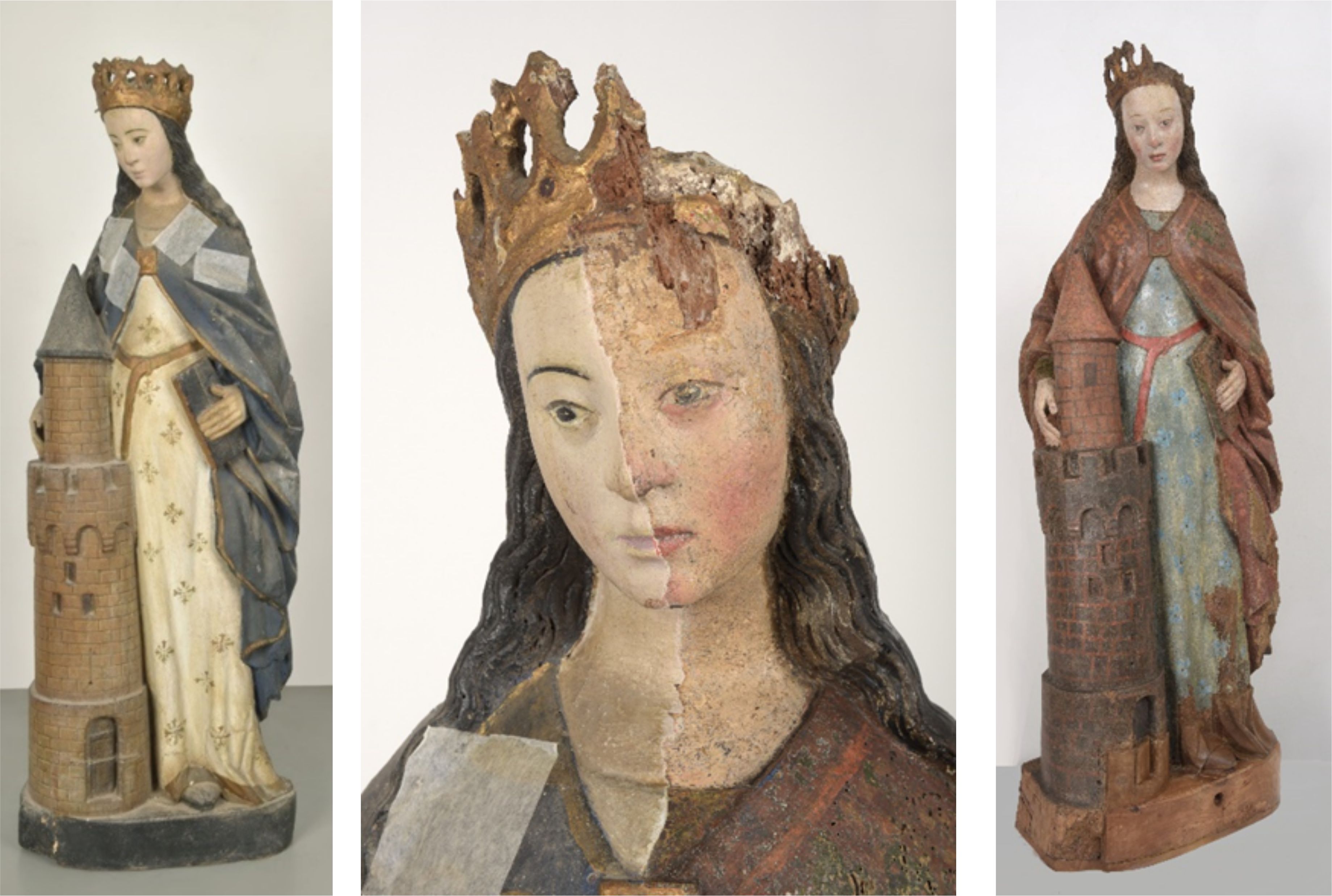 Before restoration (left), the statute of Saint Barbara showed significant damage and structural weakening. During conservation and restoration, the sculpture was disinfected with gamma rays (middle). The sculpture after restoration (right). This restoration won the contest “Save the cultural heritage of your city” in 2016. (Photos: ARC-Nucléart)
