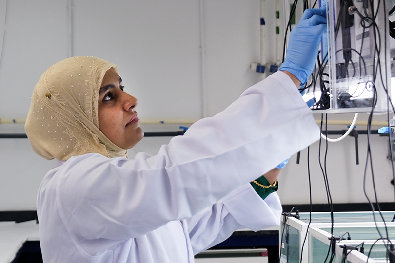 The problem of acidification in the Gulf is more complex than in other open seas. The TC project KUW7003 aims at providing insight into the effects of climate change on the Gulf’s ecosystem. In this picture, a researcher at the Kuwait Institute for Scientific Research is checking pH and temperature settings in the experimental tanks at the KISR.