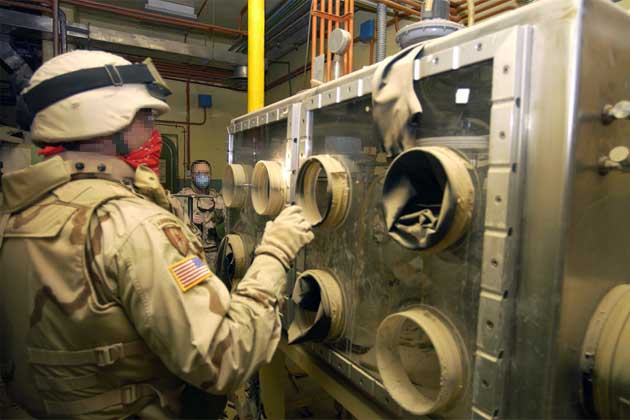 Tuwaitha's radiochemistry laboratory. Concrete was poured inside this "glovebox" equipment to secure minute amounts of plutonium. It deters potential thieves but creates an added challenge when it comes time to clean up the site.
