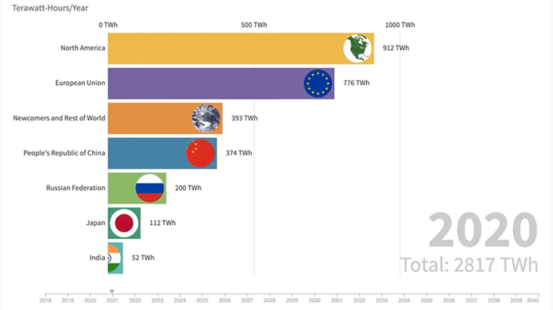目前,雖然核電在亞洲不斷擴大,但隨著北美洲等其他傳統市場的增長放緩,一些歐洲國家正在逐步淘汰核電。動畫假想方案反映了這些趨勢,顯示中國未來20年的核發電容量將翻兩番,從而超過北美洲成為領先的核電生產國。假想方案中,啟動核電國家以及非洲、東歐和南美洲已運行核電的國家的核發電容量將翻一番以上。